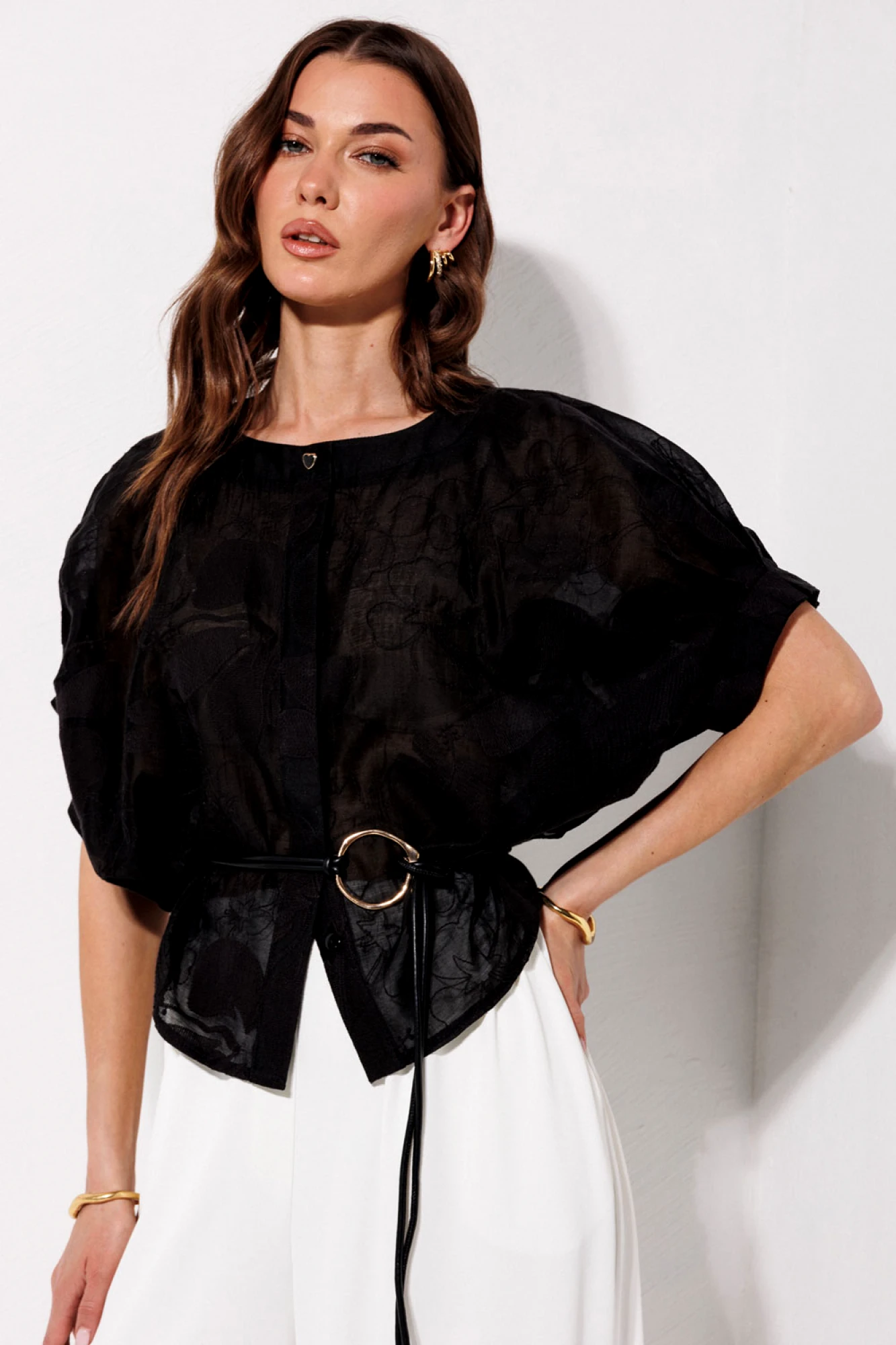 Блузка прямого силуэта из полупрозрачной ткани с вышивкой...
