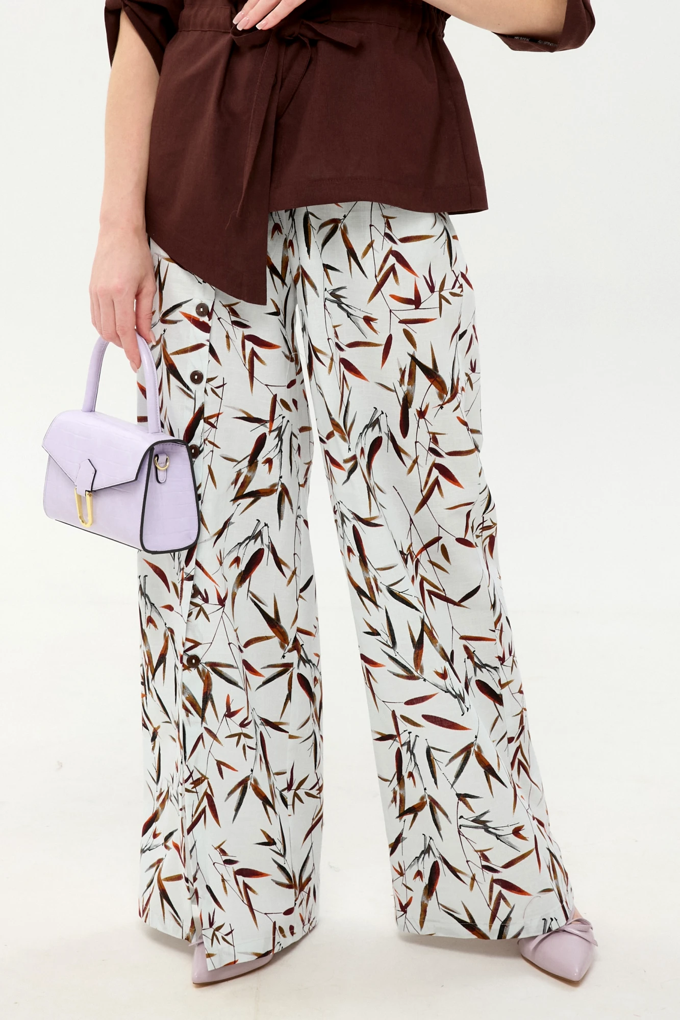 Брюки свободного кроя, верхний срез представлен широкой р...