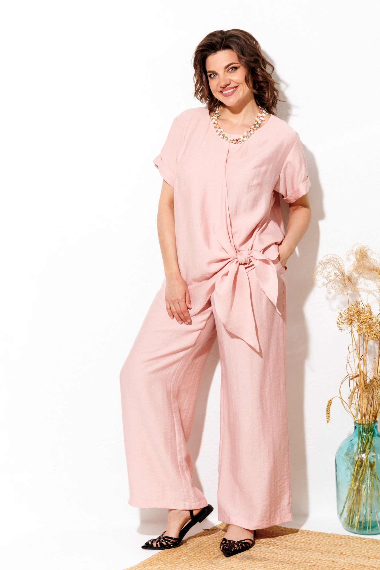Костюм состоящий из блузки и брюк выполнен из однотонной ...