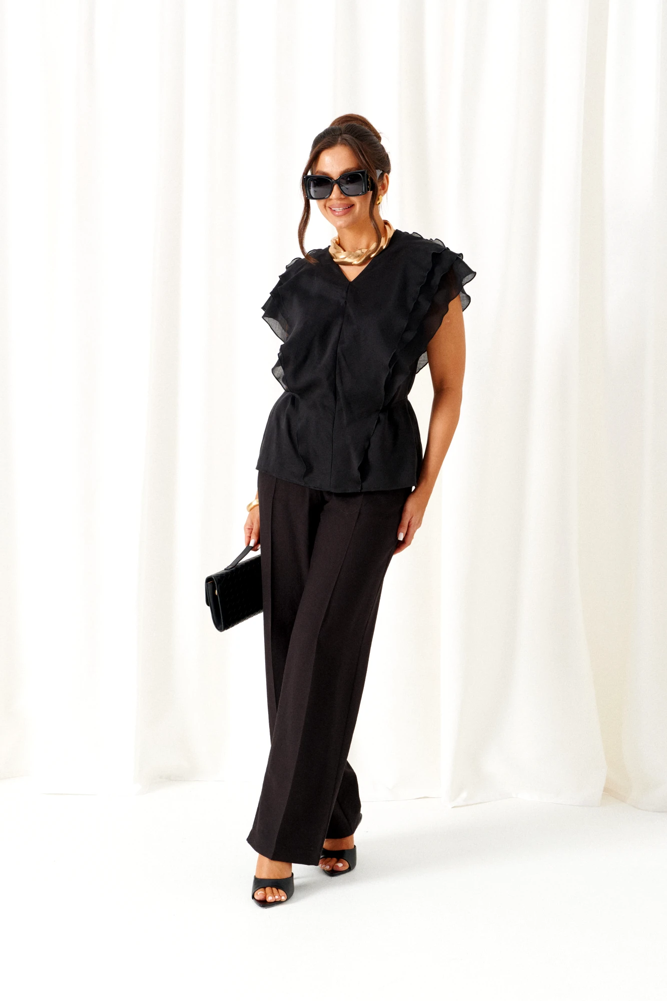 Блузка – вискоза 87%, нейлон 13%. Брюки - лен 80%, вискоза 20%